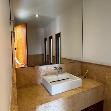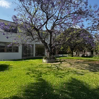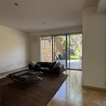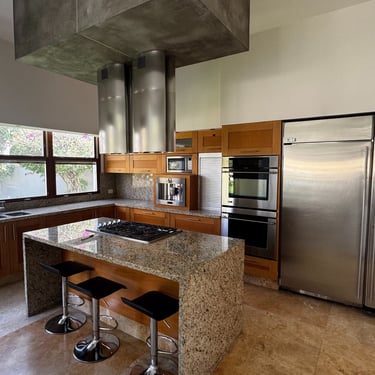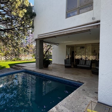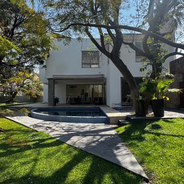 En planta baja cuenta con oficina, medio baño, amplia sala con aire acondicionado y vista a la alberca, cocina integral equipada con alacena y cafetera Bosch, bodega, área de lavado y cuarto de servicio.